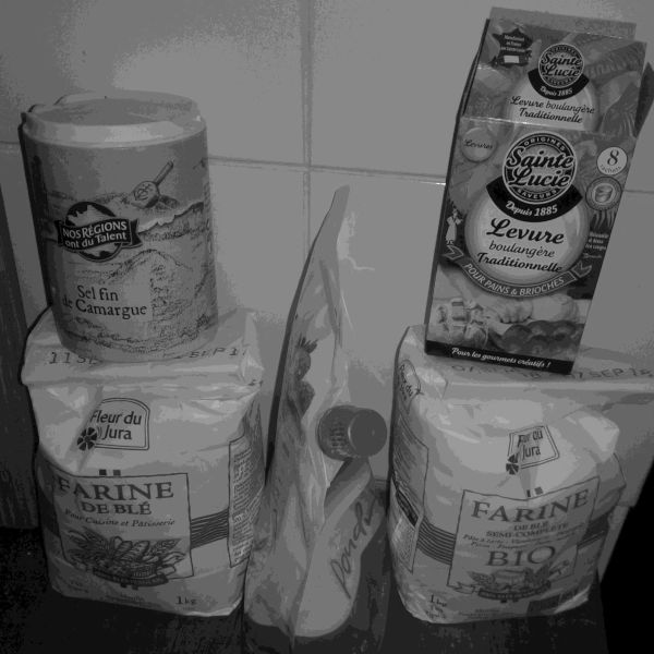 Déjà il faut savoir sur quelle quantité de farine partir. Pour une première, j'ai tablé sur 250g. Souvent les recettes tablent sur 500g, d'ailleurs cela correspond à la mesure pour 1 sachet de levure.